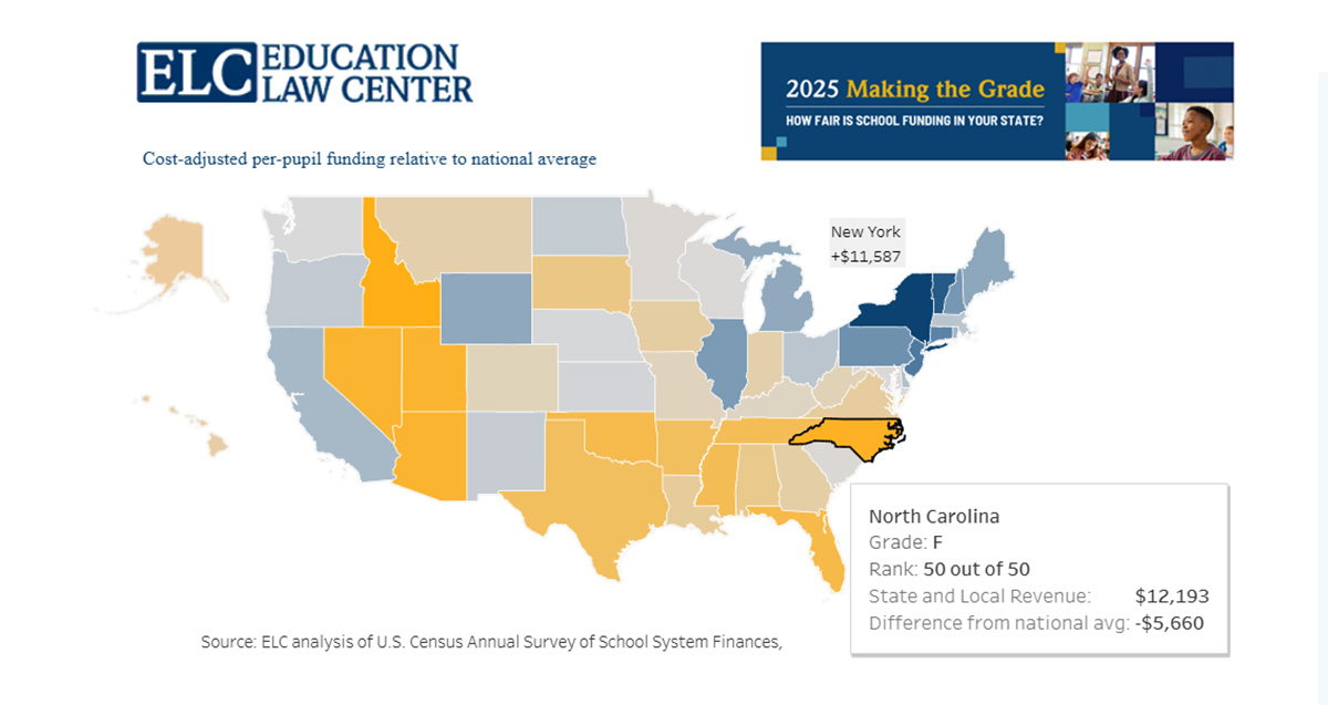 Advocates warn that continued underinvestment puts public schools—and students—at risk. The Education Law Center notes that federal instability, including potential cuts and agency restructuring, will make states even more responsible for keeping schools adequately funded in the coming years. For North Carolina, that responsibility now starts from the lowest point in the country.
