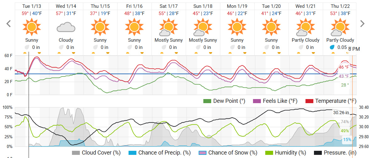 Today, highs reach about 59 with a low near 39 as southwest winds bring milder air. Clouds increase Wednesday, and highs still reach about 57 before temperatures drop overnight.