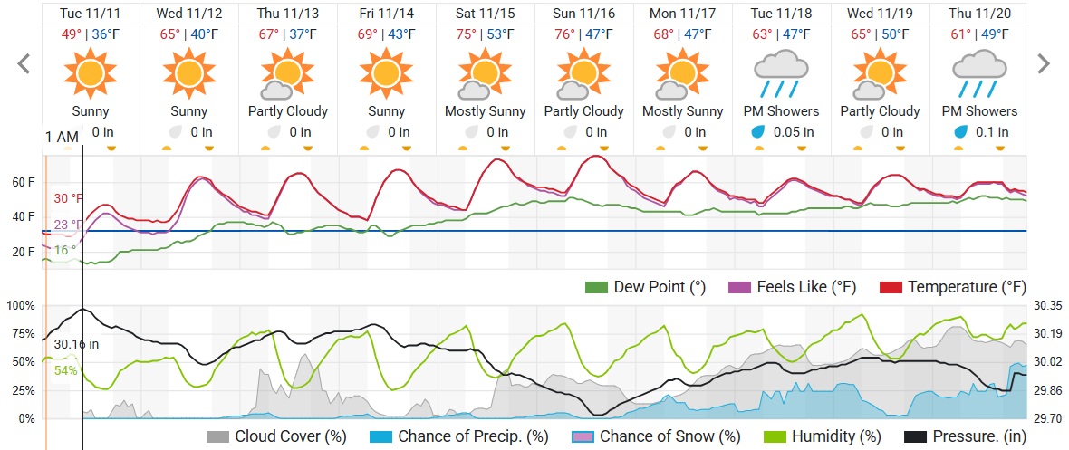 By Wednesday, highs jump to the mid-60s, and temperatures climb into the upper 60s and low 70s by Friday. The warmth continues through the weekend before another mild front moves in Sunday night, bringing slightly cooler air and a small chance of showers.