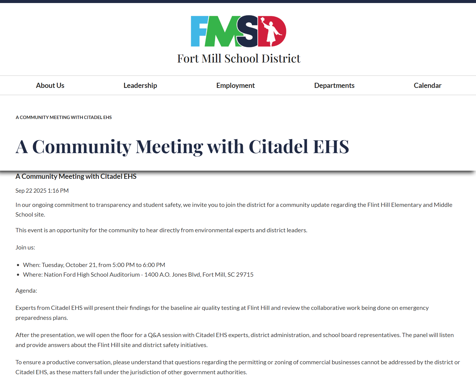 Experts from Citadel EHS will present their air-quality findings and answer community questions alongside district leaders.