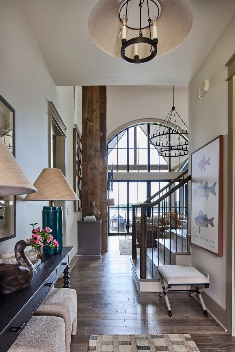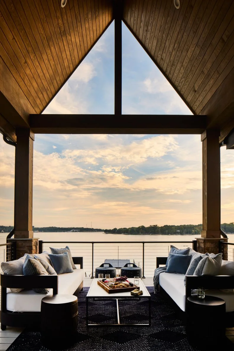The newly built, 3,000-square-foot home sits on a secluded peninsula and features three bedrooms, three-and-a-half bathrooms, and sweeping lake views. Knotts Builders constructed the property, with interior design by Brian Patrick Flynn.
