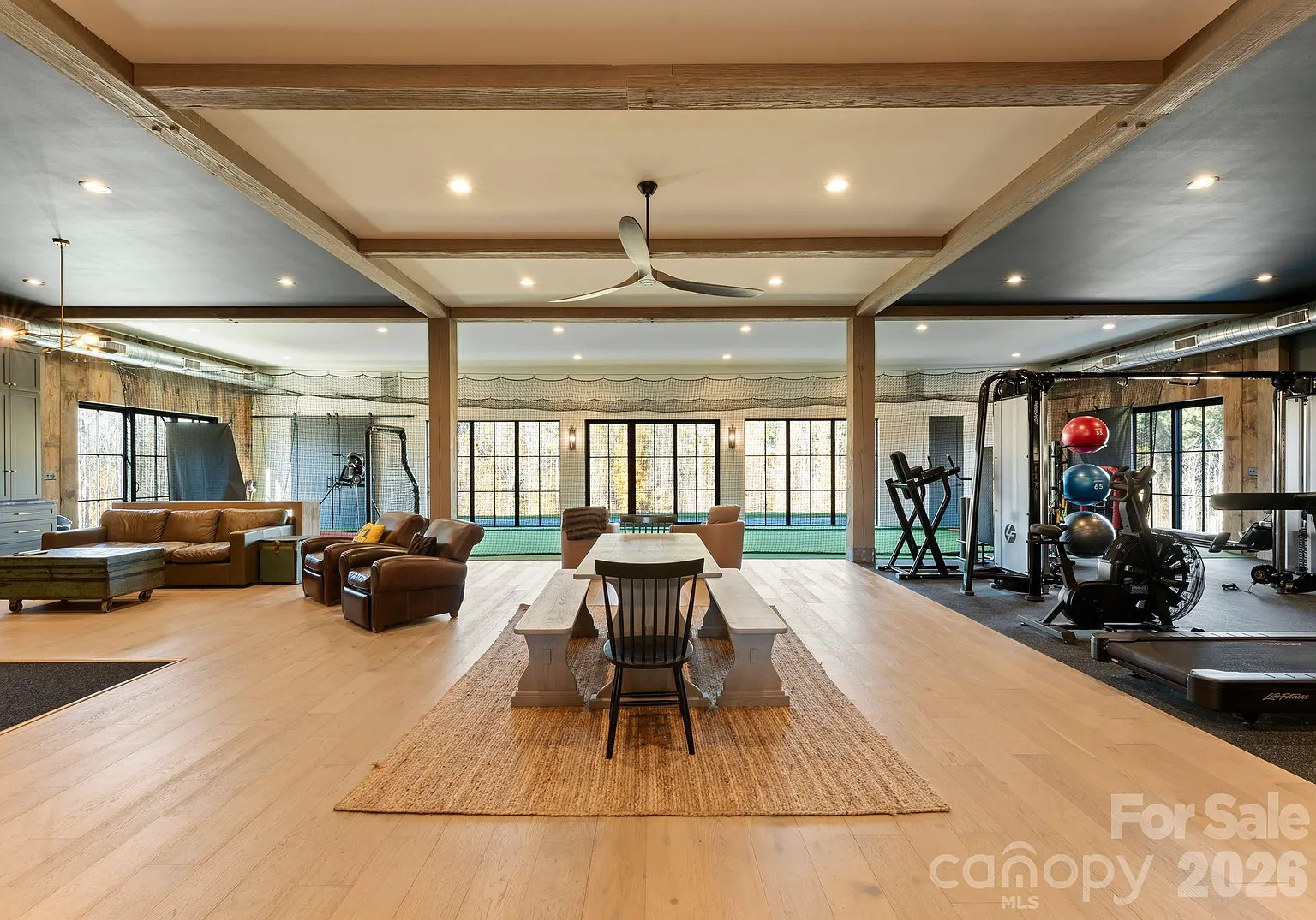 One of the standout features is a $75,000 Full Swing golf and sports simulator housed in a 3,000-square-foot barn. The space also includes a wet bar, batting cage, and fitness area.