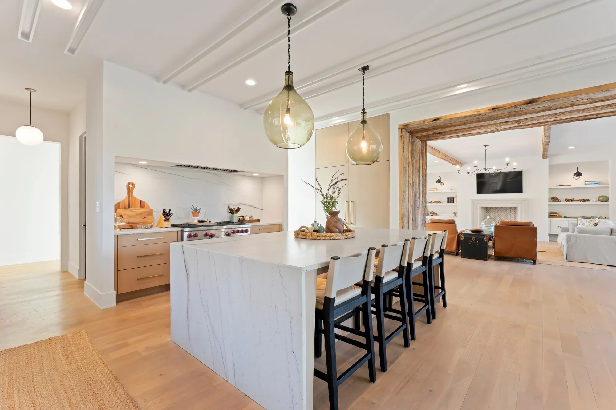 The kitchen includes premium appliances such as a Wolf gas range, built-in espresso system, wine refrigeration, and a large quartzite island designed for entertaining.