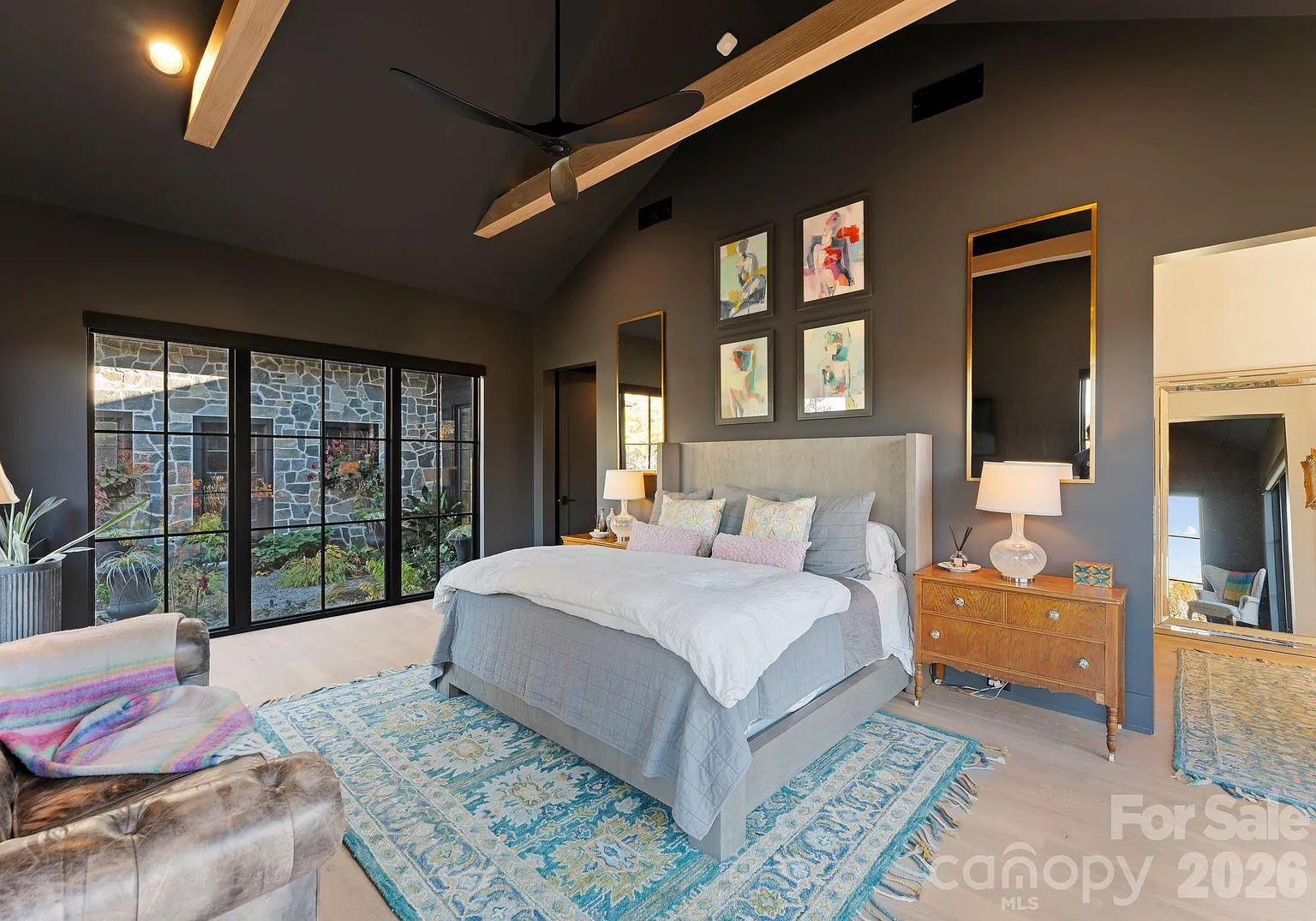 The estate sits behind a gated entrance with more than 1,700 feet of paved driveway, offering a high level of seclusion. Inside, the home features clean architectural lines, reclaimed antique wood beams, and large windows overlooking the property.