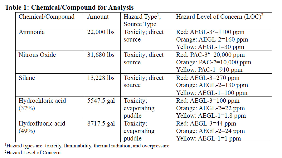 The study, commissioned by the local advocacy group Citizens Alliance for Government Integrity (CAGI) and released this week, modeled accidental releases of 5 hazardous chemicals (out of a total of 21 total hazardous chemicals Silfab would use, according to the report), including Anhydrous Ammonia, Silane, Hydrofluoric Acid, Hydrochloric Acid, and Nitrous Oxide.