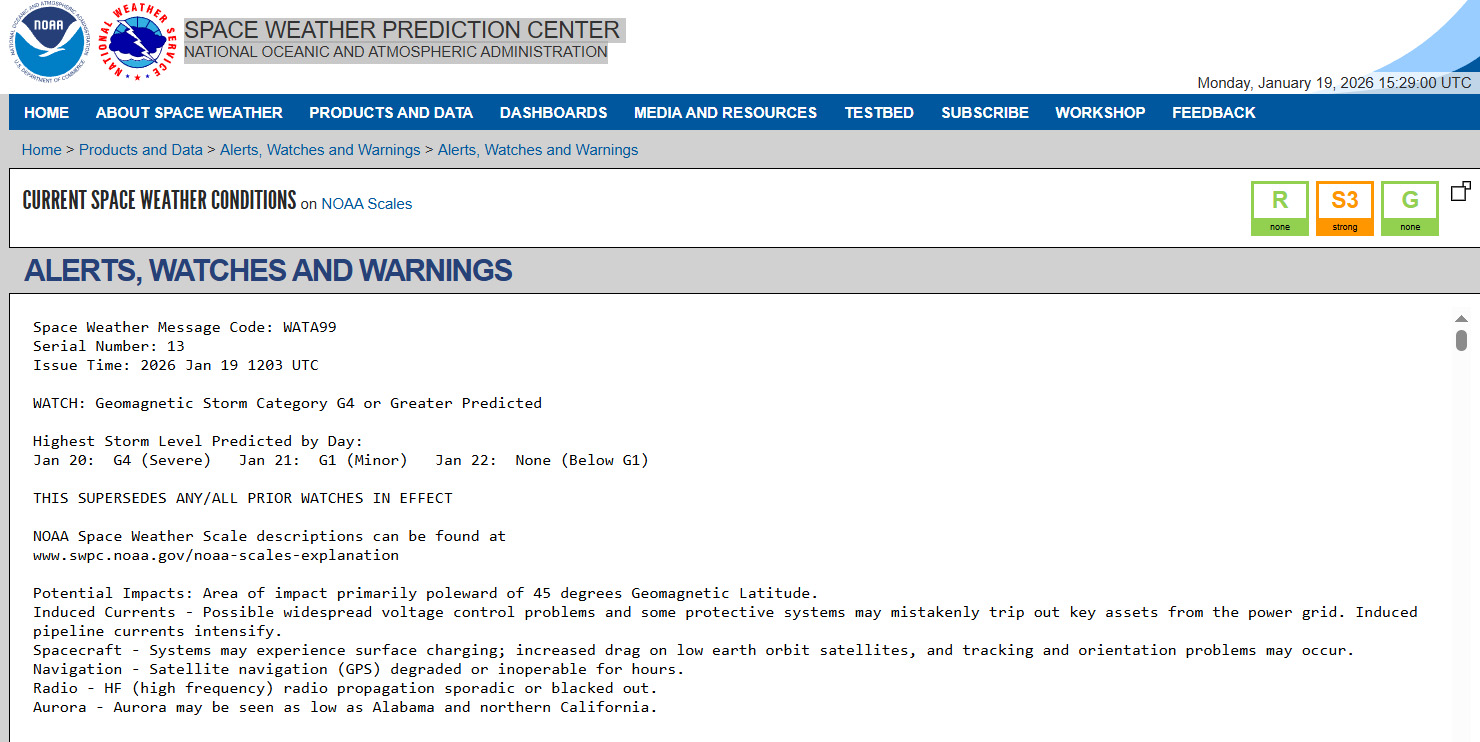The storm peaks on January 20 before weakening Tuesday. NOAA also warns of possible power grid fluctuations, satellite disruptions, and GPS interference.