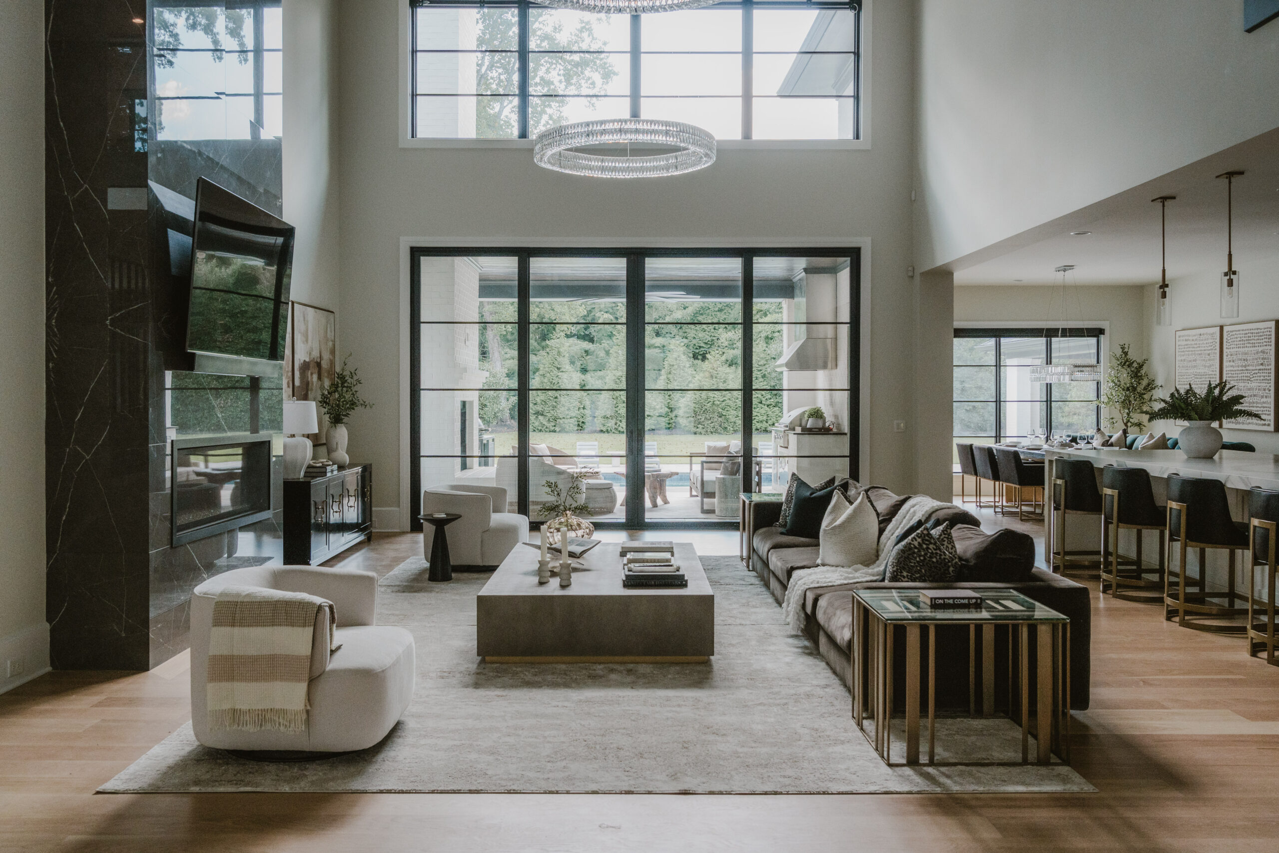 Completed in 2020, the nearly 11,000-square-foot residence was envisioned by The Studio of Christopher Phelps and built by Arcadia Homes. Sited on 1.69 acres, the home features a grand two-story great room anchors the main level, flowing into the gourmet kitchen and dining areas.