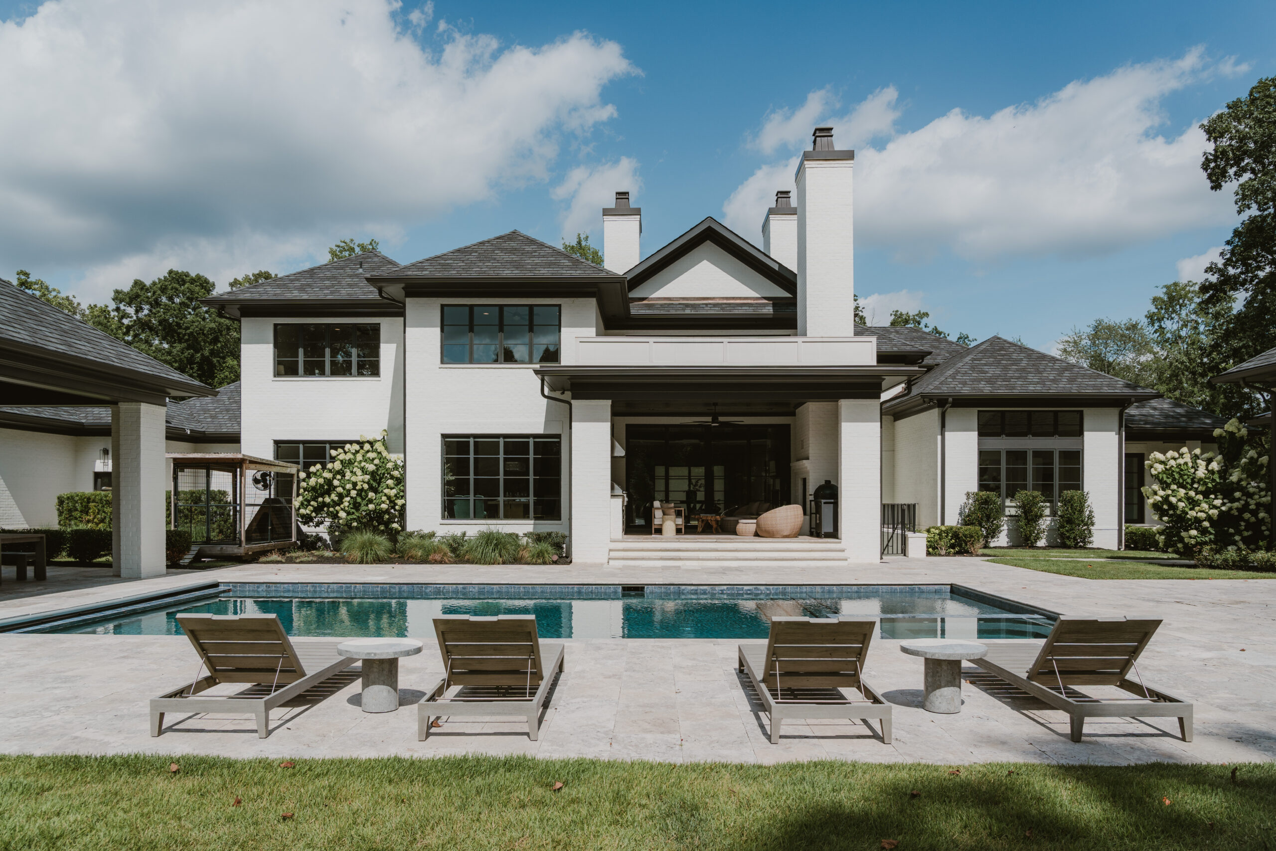Designed for resort-style living, the outdoor environment includes a sparkling pool and spa, covered cabana, grilling patio with fireplace and a private sports court. A detached wellness facility houses a fully equipped gym with sauna and steam shower, and a four-car garage.