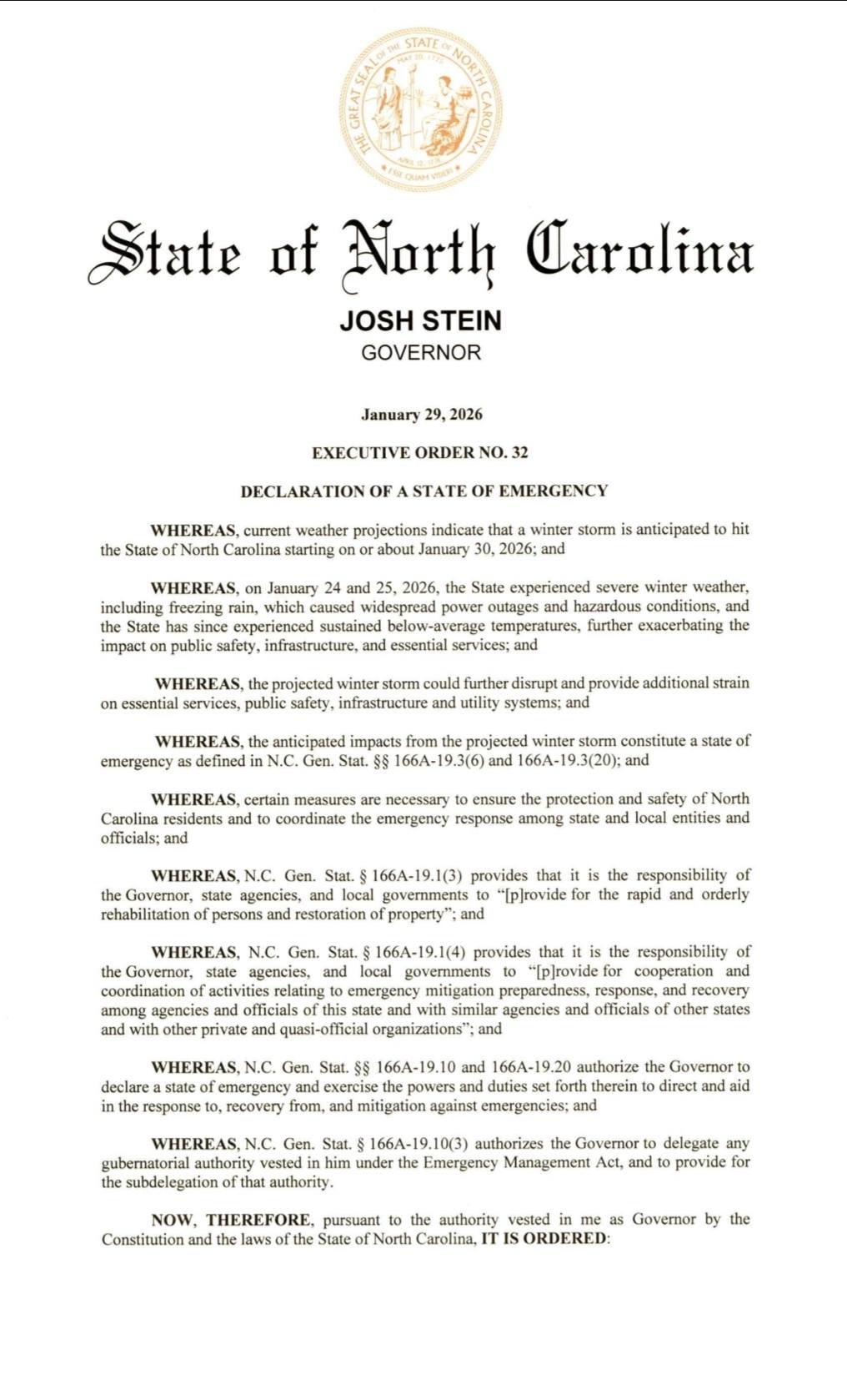 Governor Josh Stein has issued a new State of Emergency ahead of the storm. The move activates the State Emergency Response Team and ensures North Carolina can qualify for federal assistance if needed. Transportation crews continue pre-treating roads and preparing for hazardous conditions.